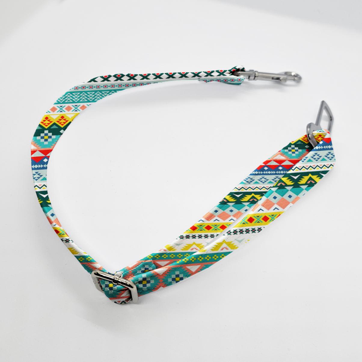 Zapięcie do auta dla psa z weluru tapicerskiego lub tkaniny wodoodpornej, zakończone karabinkiem. Regulowanej długości i w wielu wzorach.