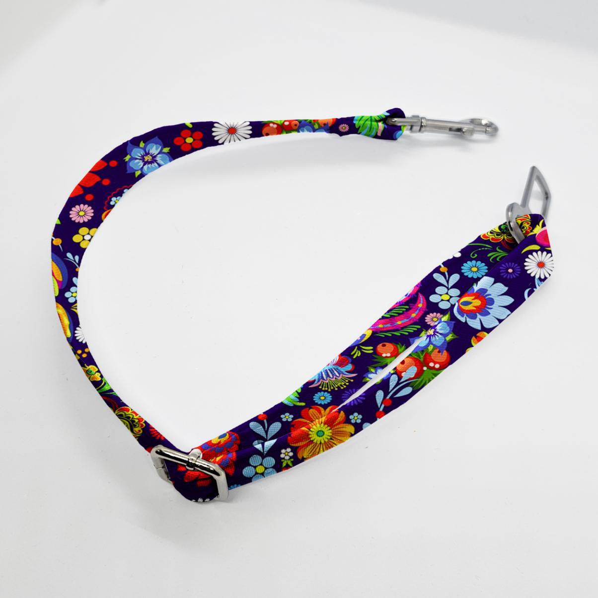 Zapięcie do auta dla psa z weluru tapicerskiego lub tkaniny wodoodpornej, zakończone karabinkiem. Regulowanej długości i w wielu wzorach.