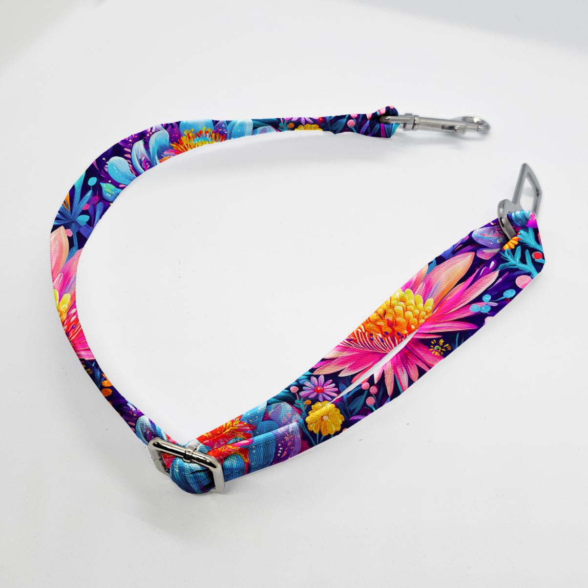 Zapięcie do auta dla psa z weluru tapicerskiego lub tkaniny wodoodpornej, zakończone karabinkiem. Regulowanej długości i w wielu wzorach.