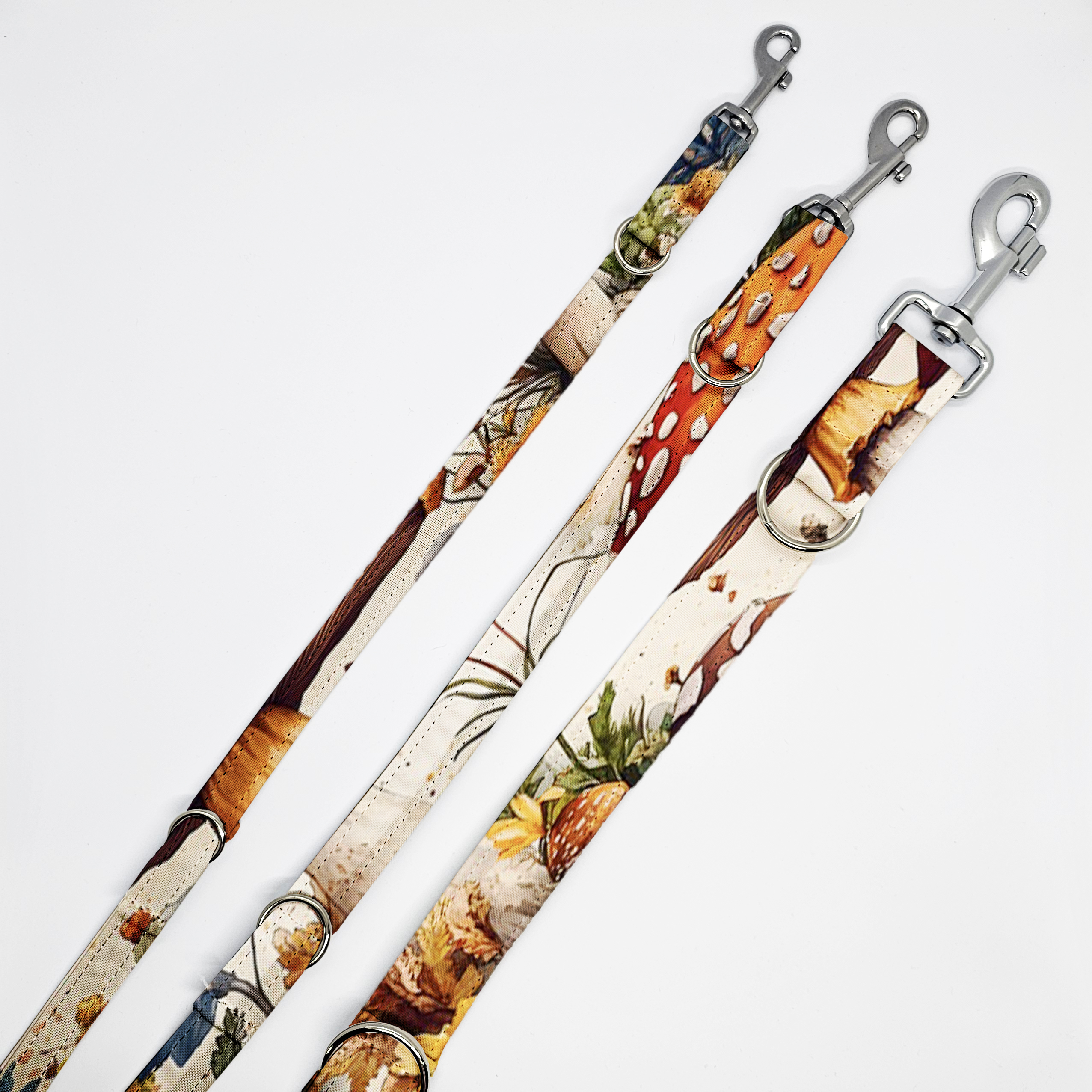 Smycz przepinana – kolorowa wzorzysta – GRZYBY NA JASNEJ ŁĄCE
