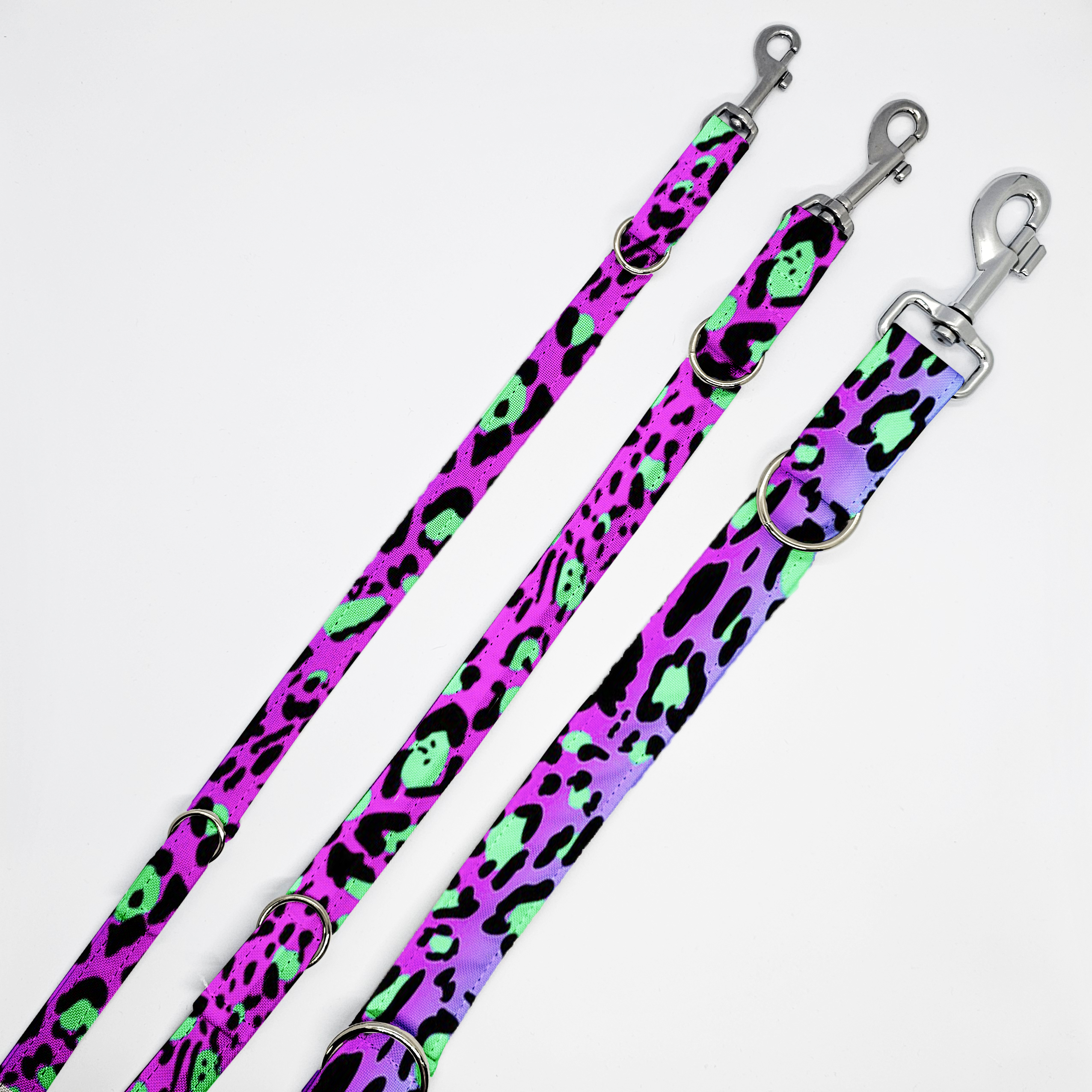 Smycz przepinana – kolorowa wzorzysta – PANTERKA FIOLETOWO-TURKUSOWA