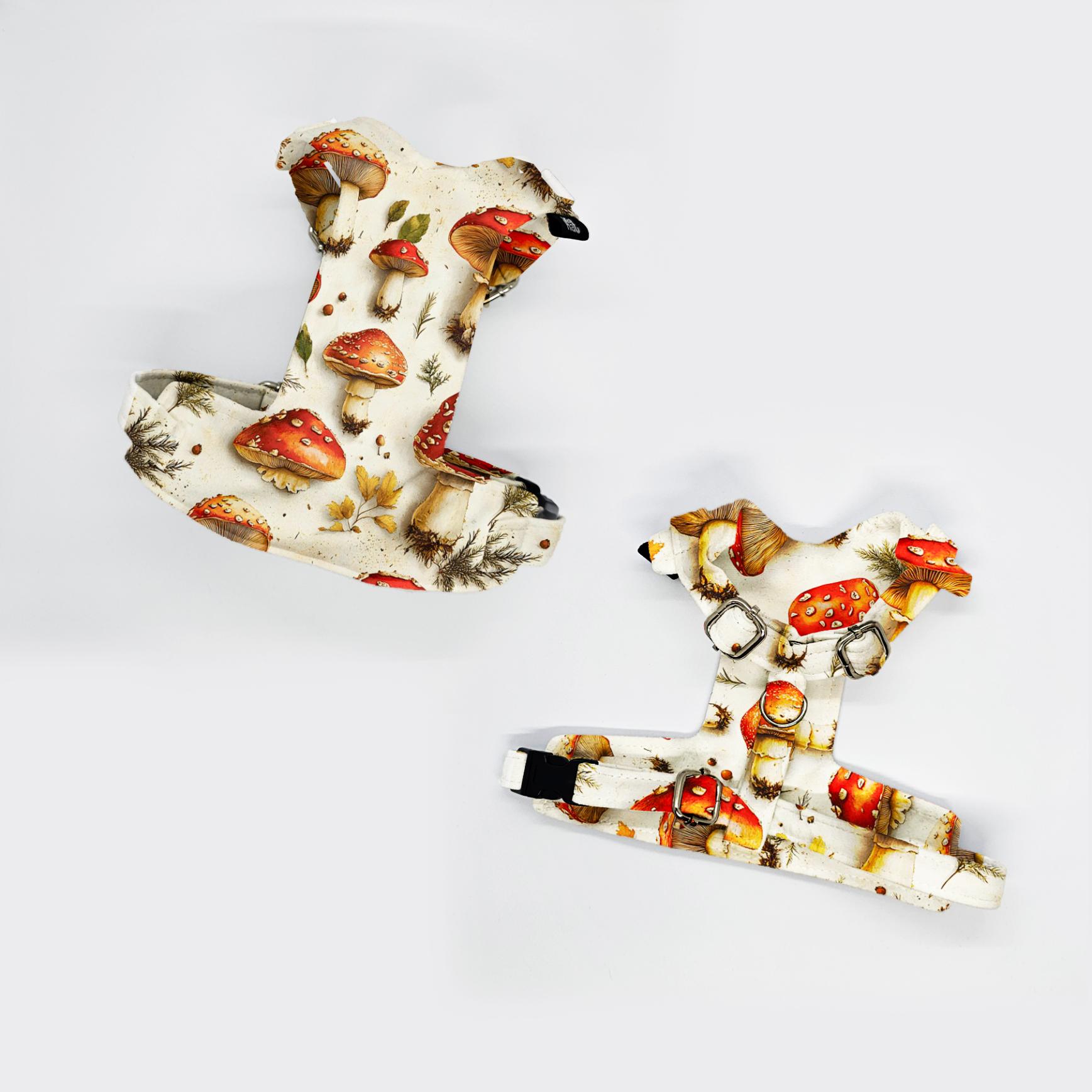 Szelki bezuciskowe dla psa – kolorowe wzorzyste – MUCHOMORY NA JANYM TLE